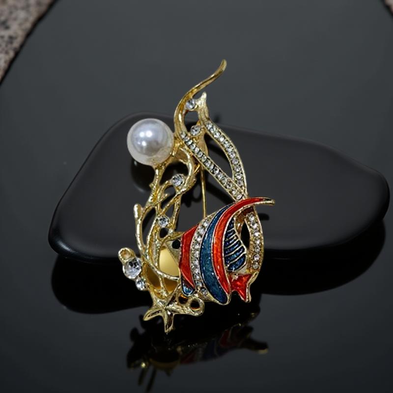Искряща брошка риба в синьо и чевено с ръчно поставени камъни и перла.